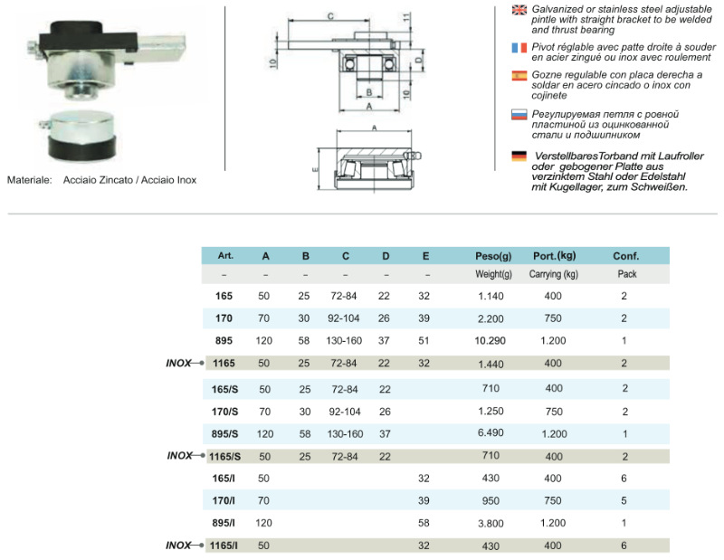 • 165/S - ADJUSTABLE HINGE WITH STRAIGHT WELDING BRACKET IN STEEL. GALVANIZED WITH BEARING - UPPER;
