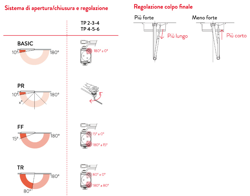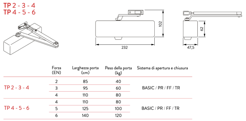 • Justor TP 4-5-6 door closer : force (EN) 4 -5 -6, door width 110 - 125 - 140 cm, door weight 80 - 100 - 120 Kg.