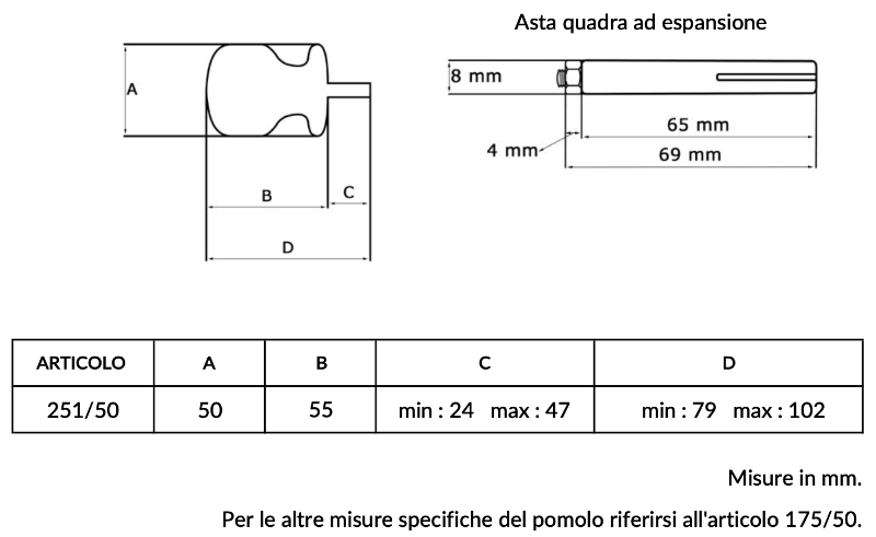 The Saguatti 251/50 rotary door knob is precision manufactured using high quality anodised aluminium, with a flat head and steel expanding square (8x65mm). Its diameter is 50mm.
