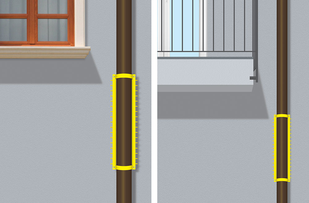 Grimpo K gutter and downpipe anti-theft tips kit, universal steel system. Made to protect home windows and balconies. Pipe diameter measures to choose from.