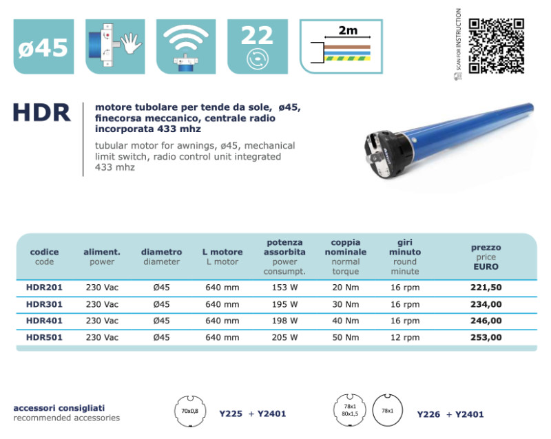 HDR401 - tubular motor for awnings, ø45, mechanical limit switch, built-in radio control unit 433 mhz