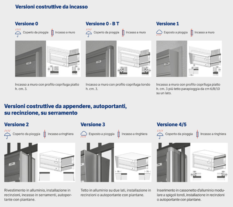 - Version 1 : recessed into the wall with flat cover profile h. cm. 3 plus rain cover;