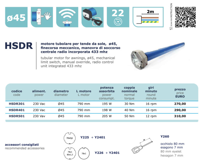 HSDR501 - tubular motor for awnings, ø45, mechanical limit switch, emergency operation, built-in radio 433 mhz