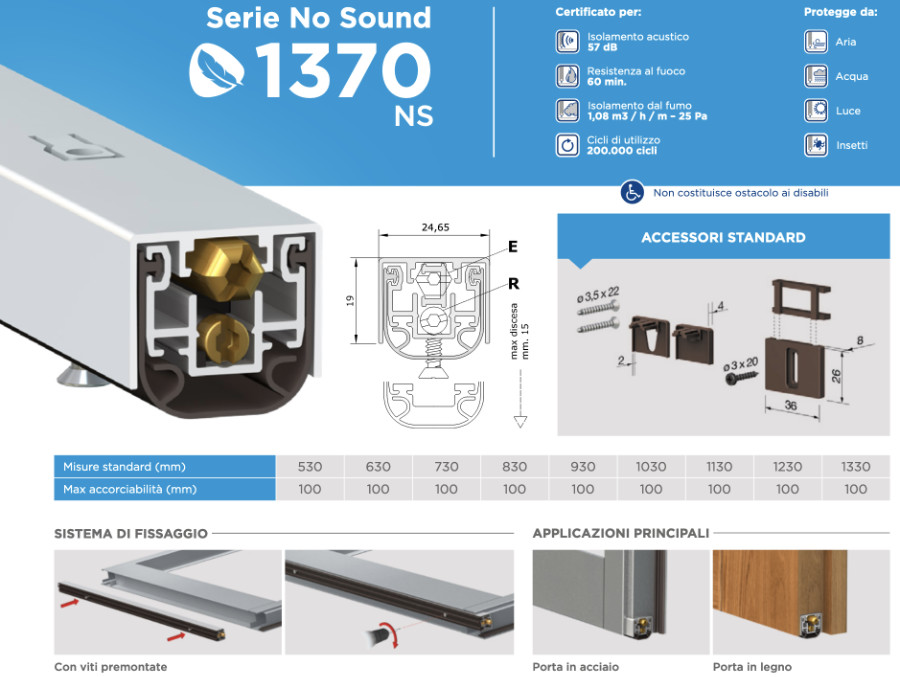 The NO SOUND series is certified for noise reduction , it is possible to equip the items in the series with a certified gasket for fire doors.