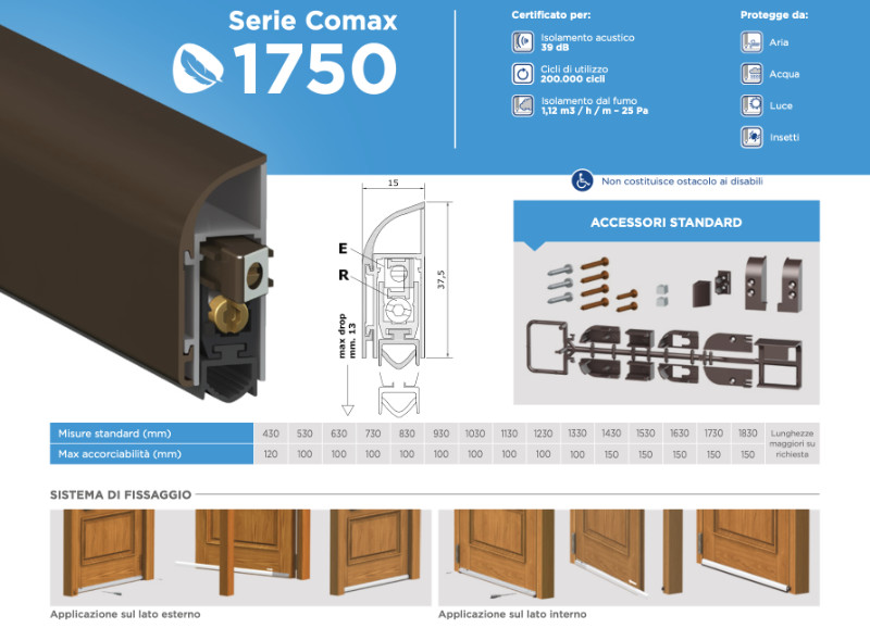 The Comaglio 1750 Comax draft excluder is a patented automatic system which, when the door is closed, automatically blocks the possibility of cold, dust and noise invading our environment.