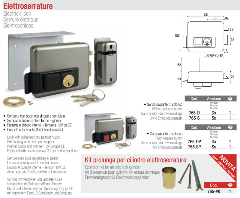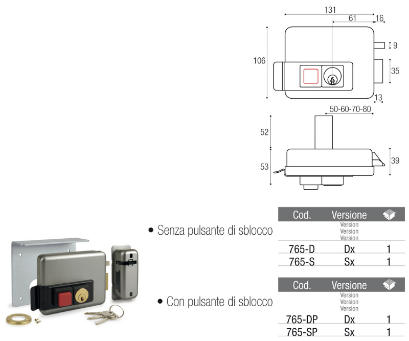 Electric lock for swing gate in the right or left version with or without release button (select the variant you want), code 765 Adem.