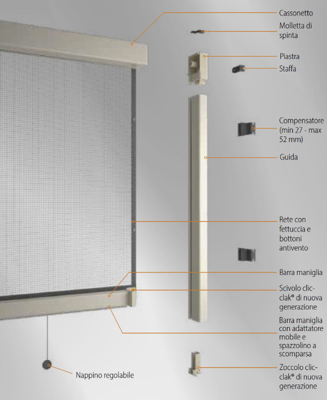The Estetika built-in insect screen is equipped with the patented Bettio system for quick coupling and release Clic-clak of the new generation which, in addition to being ideal in recessed systems where there is little space for the rotation of the handle, also has an adapter profile with a brush. which disappears inside the handle bar when rising.