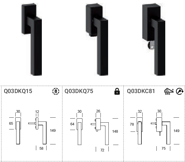 • Genève Reguitti DK window handle with 30x64mm rosette with Securblock safety button;