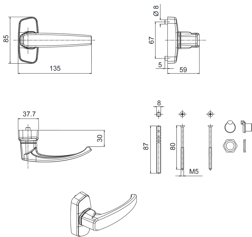 external command only handle and handle in painted zamak, tree picture, 1 socket head screw M5x30 and TS 2 screws M5x80 in galvanized steel.