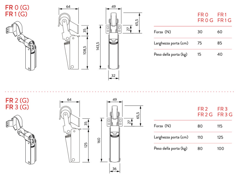 Closing system: fixed or adjustable closing speed (only models with adjustable closing system).