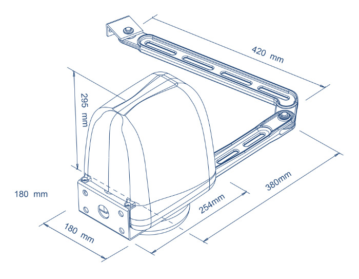 The IBIS VDS Automation arm gate motor has a thrust force of 250 NM and lifts a maximum of 200 kg in the 230V version or 150 kg for the 24V.