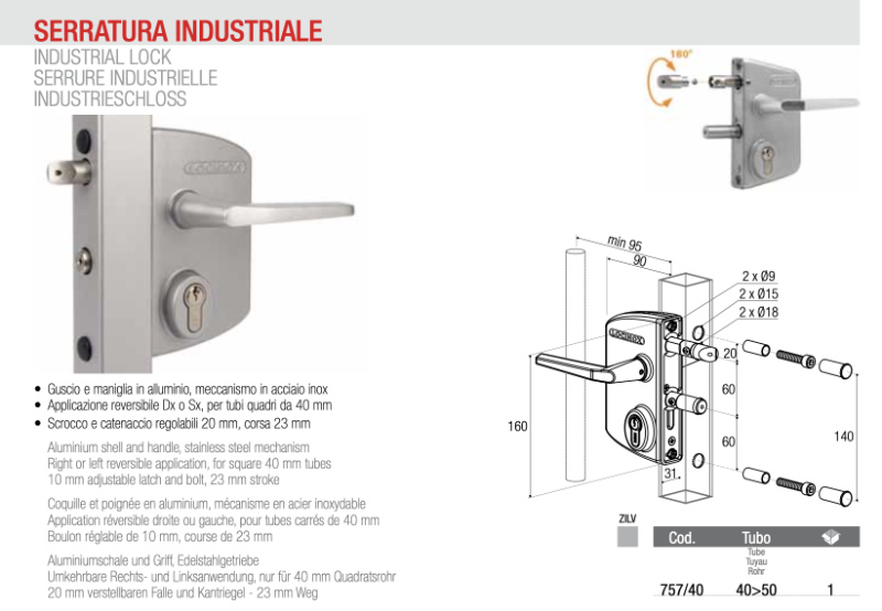 This lock has been designed to withstand the stresses typical of industrial environments and can be installed on gates and doors of various sizes thanks to its reversible application and adjustable mechanism.