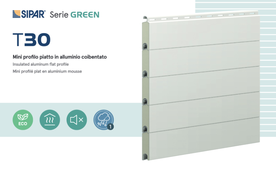 Rolling shutter with insulated aluminum profile, Sipar T30 Green Series brand model. Italian production roller shutter equipped with a flat mini profile.
