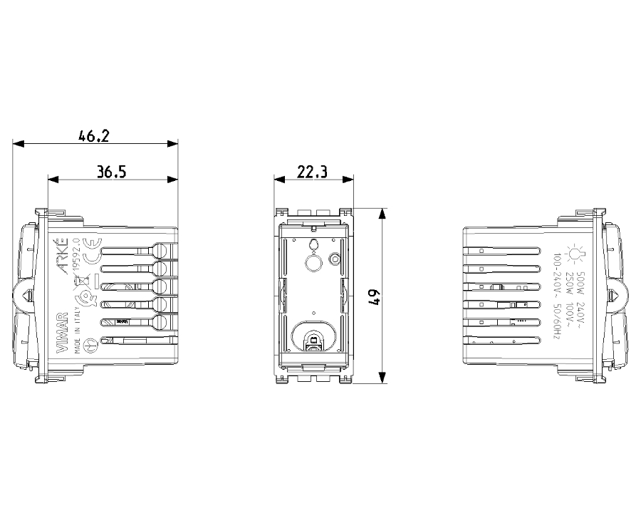 The Arké Vimar diverter mechanism allows local or remote control, has double IoT technology on Bluetooth 5.0 standard for creating VIEW Wireless mesh system and on Zigbee 3.0 standard, 1 input for external button for actuator control or for recalling a scenario, identification in the dark with RGB LEDs with intensity adjustment, power supply 100-240 V 50/60 Hz, to be completed with interchangeable keys 1 module and 2 Arké modules.
