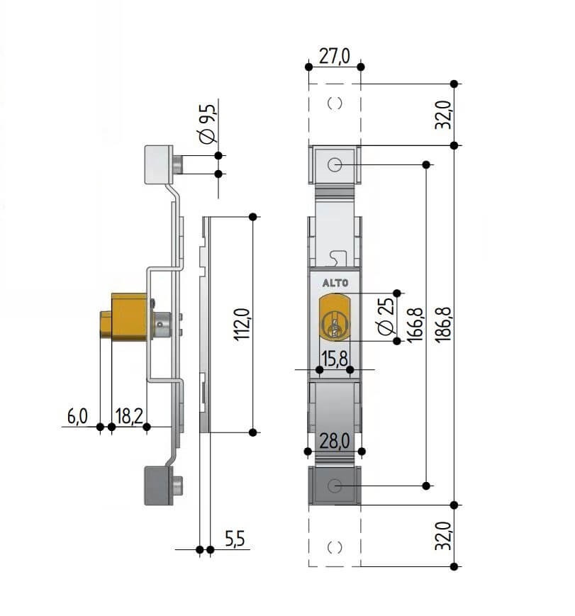 • Dimensions: box mm. 112 x 28 - bolt width mm. 27 (attack);