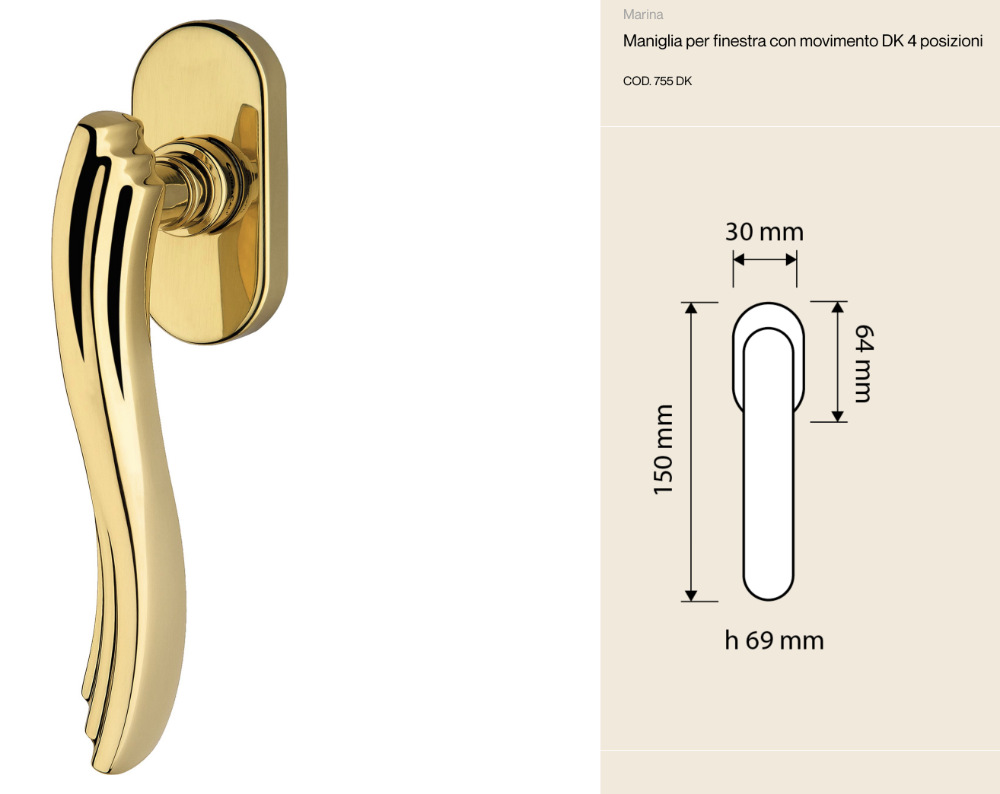 Marina Linea Calì 4-position DK window handle: Made in Italy brass, ergonomic laminated grip, choice of finish. A timeless classic, thoughtfully designed ergonomics.