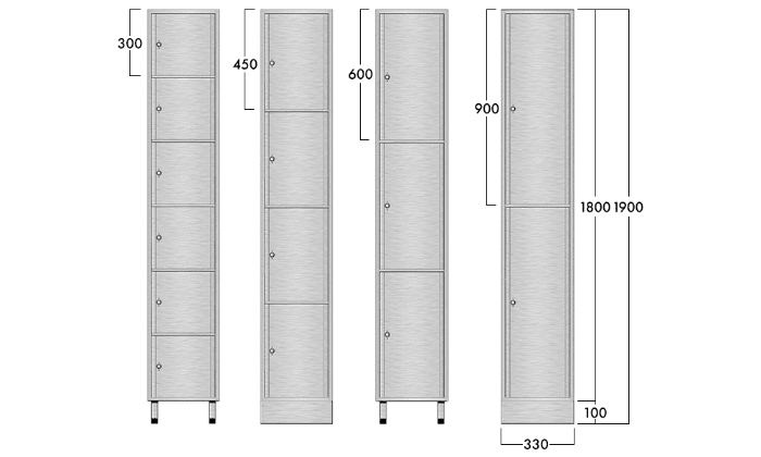 - Doors in white anti-scratch integral laminate (HPL) or in aluminum th. mm. 2, rotating on a full-height hinge, longitudinal edging with round edges in extruded anodized aluminum, vandal-proof closure flush with the structure, progressive numbering engraved;