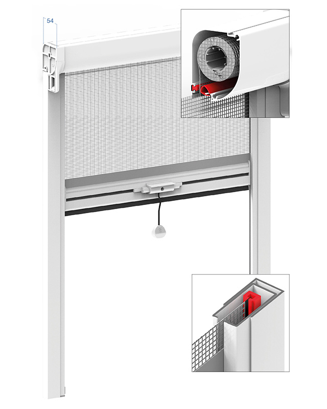 It is a spring-loaded mosquito net with a 50mm rounded vertical sliding box and characterized by a net with a zip system and the particularity of being an anti-bedbug mosquito net model.