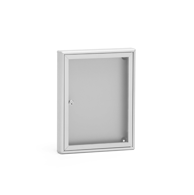 The rounded edges and the plexiglass door make them safe and resistant. All bulletin boards are equipped with locks with the same numbering.