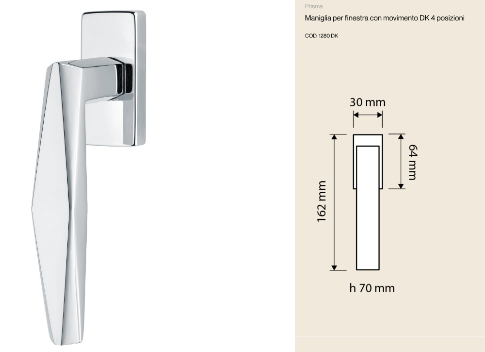There are window handles that go beyond the simple function of opening and closing: the DK Prisma Linea Calì window handle is a true work of design. With its rhomboid grip and faceted surfaces, it captures and reflects light in ever-changing ways, transforming every window into a statement piece.