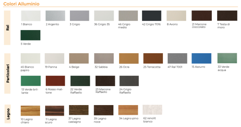 Choose the color you want for your new Effezeta System brand aluminum roller shutter. Wood effect colors are also available.