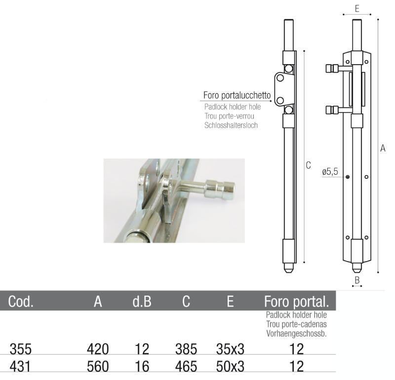 Vertical stainless steel bolt without keep for safety and protection from intrusions.