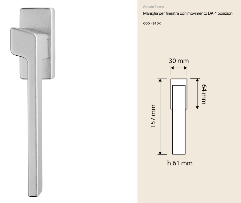 Stream Zincral Linea Calì, modern window handle, with a geometric and minimal design, elegant and comfortable to the touch.