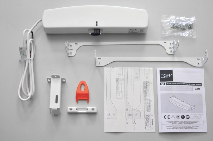 Topp electric actuator model C30 230V with double-link articulated chain, contained in a special casing, complete with support and accessories for top-hung or bottom-hung opening.