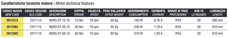 • Code: 2812364 - NERO-ST 30-16 - Torque 30 Nm - Speed 16 rpm - Raised weight 55 Kg - Absorption 240 W - Current 1.10 A - Protection degree IP44 - Rpm FC 30 - Length 610 mm;