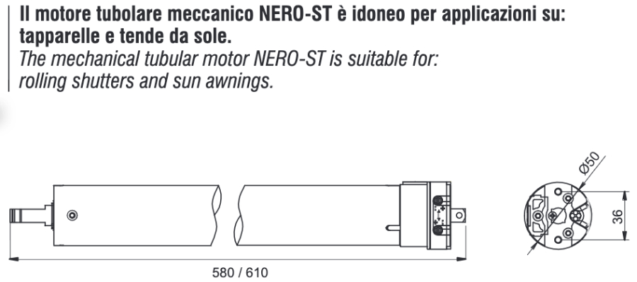 The Ø50 NERO-ST mechanical tubular motor is suitable for use on rolling shutters and awnings.