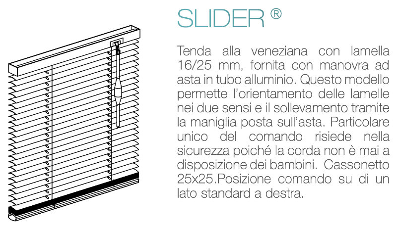 - Venetian blind Slider 16 mm is a blind with safe control Slider and rod for orientation;