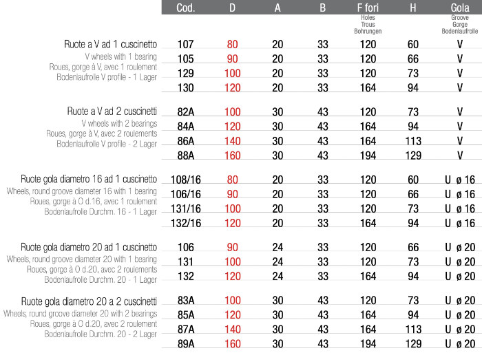 Wheel sizes with internal Adem support (diameter, tube, groove, capacity kg and bolt):